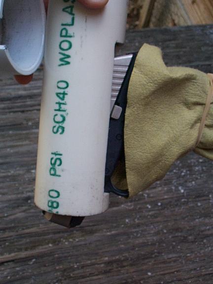Now insert a primered only case, put the pistol in the PVC holder, hold
